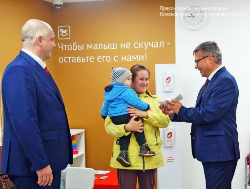 Первым посетителем обновленного МФЦ стала Елена Биберина. Она получила удостоверение многодетной матери. В семье Бибериных воспитываются две девочки и два мальчика в возрасте от 1 до 15 лет. Директор многофункционального центра ГАУ «МФЦ» Тверская область Денис Прудников и первый заместитель главы администрации Конаковского муниципального округа Виктор Садчиков вручили Елене удостоверение и памятный подарок.
