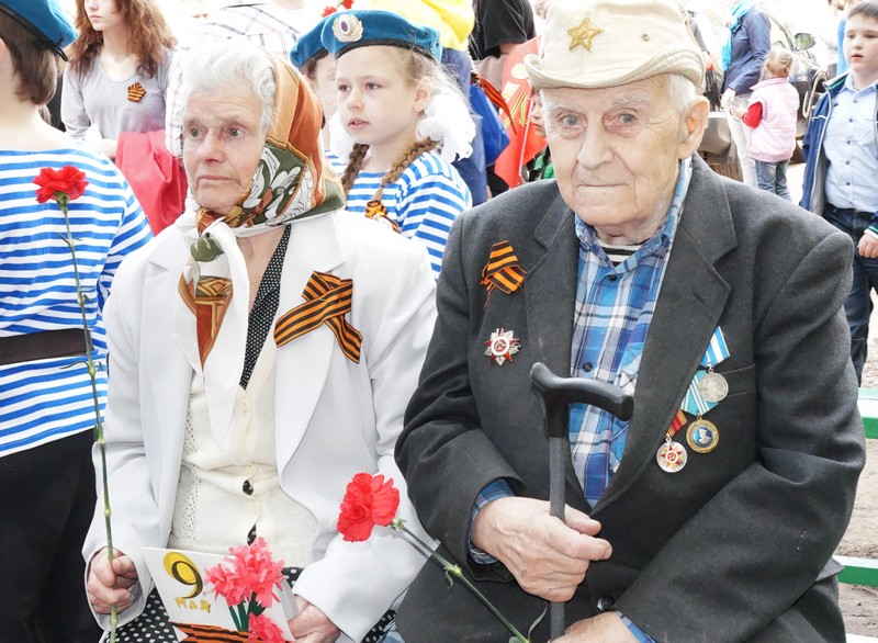 Несмотря на то, что митинг немного затянулся, настроение у собравшихся было по-настоящему праздничным. Многие принесли с собой самодельные транспаранты с военными фотографиями своих дедов и прадедов. Женщины и дети щеголяли в пилотках, военно-морских воротниках и прочих элементах военной формы — чтобы лишний раз подчеркнуть, по какому поводу здесь собрались. Большинство людей пришли с цветами. И практически у каждого на груди была георгиевская ленточка.