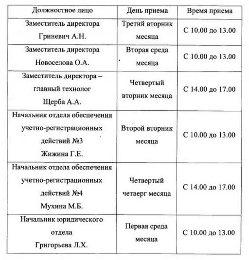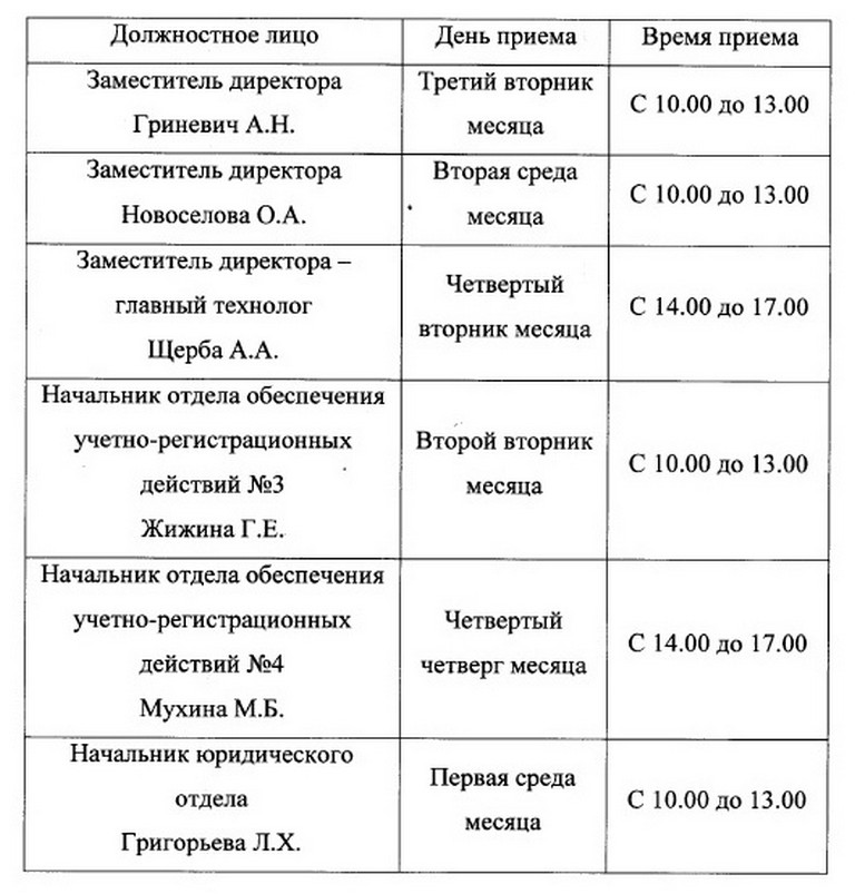 Личный прием граждан заместителем директора ФГБУ «ФКП Росреестра» осуществляется в порядке очередности, согласно предварительной записи и в течение установленного времени. Продолжительность личного приема по одному вопросу не более 30 минут.
